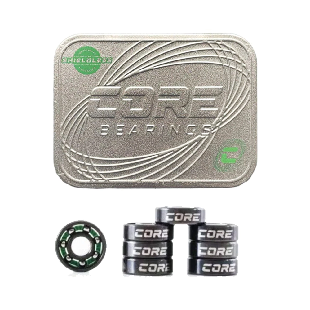 Rolamentos Core, foram testados e aprovados pela equipe profissional , são velozes e duráveis. Desenvolvidos com gaiola em nylon extra resistente, construídos com 7 bolas de aço de alta qualidade e por não terem o escudo não acumulam sujeiras na parte interna, facilitando a limpeza, trazendo menos contato com o escudo protetor e oferecendo melhor performance que os rolamento tradicionais.