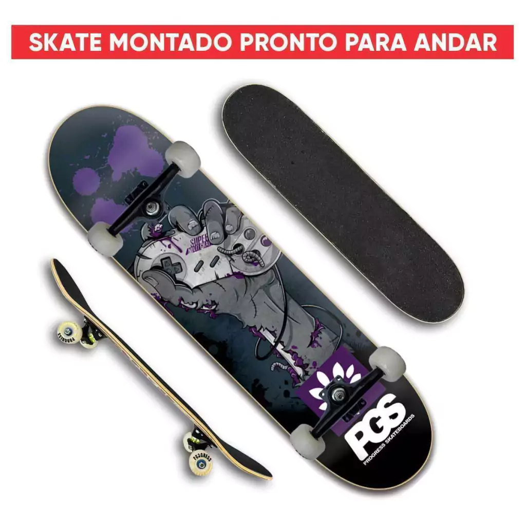 A Progress é uma marca que acompanha o progresso do Skate e entende as necessidades dos skatistas.Pensando nisso criou seu skate Profissional com peças resistentes e de qualidade para que o skatista possa desenvolver todo o seu potencial não importando seu nível.O skate Progress - PGS Profissional suporta até 130kg tranquilamente e seu skate pode ser usado tanto por crianças quanto por adultos.Temos o skate em varias larguras e desenhos diferentes, você pode encontrar facilmente aqui mesmo no site, são diversos modelos para você escolher o que mais lhe agrada. As peças que acompanham o skate Profissional PGS são de excelente qualidade.Shape Profissional Progress - PGS (o mesmo usado por skatistas profissionais)Whellbase: 35 cm (Entre eixos)Material: Produzido com 7 lâminas selecionadas de madeira marfim, coladas com resina epóxi.Largura: 8.0"polegadas / 20,32 cmComprimento: 31.8"polegadas / 80,8 cmIndicação: StreetOrigem: NacionalPeso Aprox.: 1.35 kg Furação feita com cabeçote múltiplo, permitindo o ajuste preciso dos parafusos de base com ótimo acabamento. Atualmente a Progress, está entre as marcas nacionais mais respeitadas, principalmente por desenvolver shapes de ótima qualidade e já ter patrocinado grandes nomes do skate nacional.Truck de skate Progress - PGS Profissional 139mmFeito em alumínio de alta qualidade e resistência ideal para quem já anda de skate a algum tempo e já acerta varias manobras.Rodas de skate, feitas de Urethano fundido ( A marca da roda é de acordo com nosso estoque )Feitas em Urethano uma roda seca com excelente qualidade, produzida em um das melhores fabricas de rodas mundo, boa para vários tipos de terrenos e larguras de shape.Lixa para skate EmborrachadaA lixa emborrachada é importada e de excelente qualidade e tem uma excelente aderência e não gasta tanto o tênis na hora de executar as manobras como as lixas nacionais.Rolamentos de skate da linha ABEC Parafusos para skate Progress - PGS porca 3/8A mesma medida dos melhores parafusos de skate do mundo.