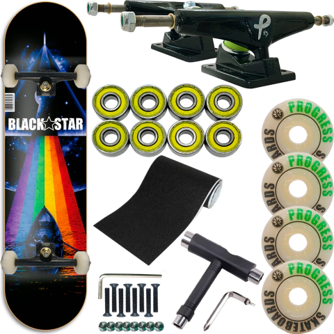 Skate Black Star Profissional completo pronto para andar. o skate é composto por shape de 7 laminas de eucalipto Resinado, com lixa grão 80, O Truck PGS Profissional é feito em liga de alumínio para uma leveza maior e resistência também. No tamanho 139mm, Indicado para categoria street Pode ser usado por crianças e adultos de qualquer peso. A Roda Progress PGS 54 , foi fabricada com poliuretano injetado e proporciona boa velocidade em diversos tipos de solo, como madeira ou concreto Recomendada para todas as idades . Modelo: semi pro Dureza: 95A Kit com 8 rolamentos Abec de alta qualidade com acabamento exclusivo , Lubrificado e vedado, enviamos da numerações mais altas entre 9 e 15 de acordo com o estoque) Indicado para todas as modalidades. Parafuso de Base 3/8 fabricados em aço de ótima qualidade tendo assim uma menor probabilidade de espanamento, porcas auto-travante garantindo uma melhor fixação. Acompanha 8 Parafusos + 8 Porcas ( 3/8 em polegadas) + uma Chave T, com boca para porca 13 paras rodas , 14 para o parafuso central , 3/8 para as porcas da base do truck e chave allen