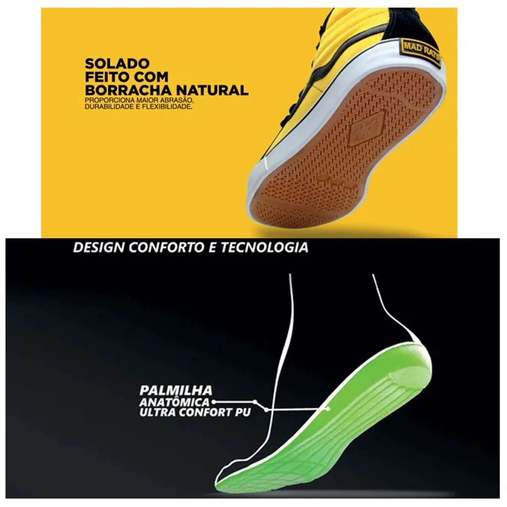 Old School, o modelo de tênis de skate mais tradicional da Mad Rats, indispensável para quem curte ousar no Street Style. Garante atitude de sobra e muita maciez ao caminhar. Versátil, é ideal para o dia a dia, mas vai bem com uma beca mais irada.
