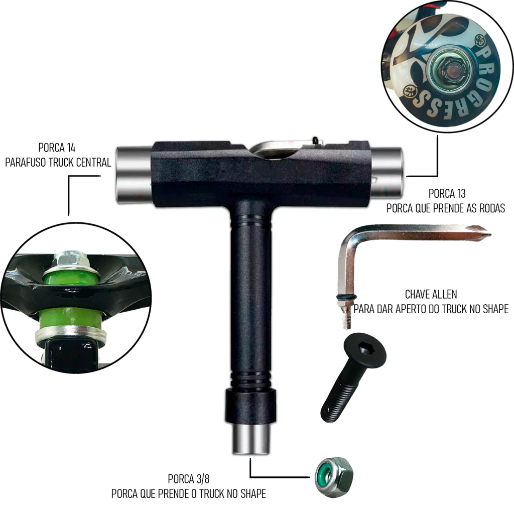 A Progress é uma marca que acompanha o progresso do Skate e entende as necessidades dos skatistas. O Truck PGS Profissional é feito em liga de alumínio para uma leveza maior e resistência também. No tamanho 139mm perfeito para quem usa shapes 7.75 e 8.25 Indicado para categoria street Pode ser usado por crianças e adultos de qualquer peso. A Roda Progress PGS 54 , foi fabricada com poliuretano injetado e proporciona boa velocidade em diversos tipos de solo, como madeira ou concreto Recomendada para todas as idades . Modelo: semi pro Dureza: 95A Kit com 8 rolamentos Abec de alta qualidade com acabamento exclusivo , Lubrificado e vedado. Indicado para todas as modalidades. Parafuso de Base 3/8 fabricados em aço de ótima qualidade tendo assim uma menor probabilidade de espanamento, porcas auto-travante garantindo uma melhor fixação. Acompanha 8 Parafusos + 8 Porcas ( 3/8 em polegadas) + Chave Alen - Parafuso feito em alumínio de alta resistência.